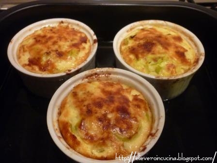 - Unire il porro al composto di uova e formaggio, mescolare e suddividere nei pirottini da forno precedentemente imburrati.