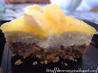 - La copertura. Ammorbidite la colla di pesce in acqua fredda per 10 minuti. Fate scaldare in una padella l'ananas tagliata a tocchetti con lo zucchero, aggiungete la colla di pesce strizzata, e lasciate cucinare fino a che il frutto non assorbe quasi totalmente lo sciroppo creatosi. Mettete poi il tutto nel frullatore finchè il composto non sarà liscio. Lasciate raffreddare e poi, con un cucchiaino, stendere la gelatina di ananas sulle tortine estratte dal frigo. Coprite bene la superficie e rimettete in frigo a rassodare per almeno un'altra ora prima di servire!